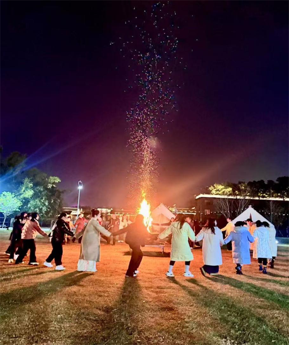 活动中,全体教师欢聚一堂,欣赏古朴建筑与自然风光,亲手制作手工蛋糕,互赠心意。夜幕降临,篝火晚会将欢乐推向高潮,女神们围坐篝火旁,参与趣味游戏,挑战户外KTV。