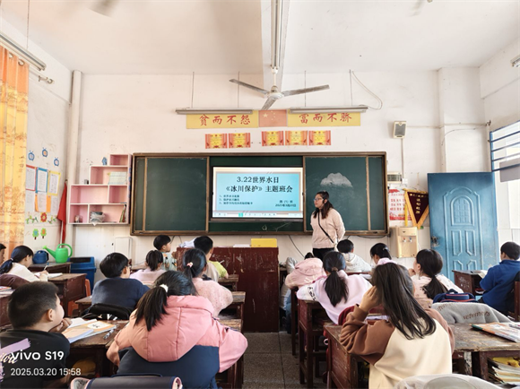 升旗仪式上,一场“携手节约用水守护生命之源”演讲及表演拉开了活动序幕。学生们用真挚的语言、生动的表演,向全校师生发出节约用水的倡议,在校园里播下了节水护水的种子,激发了大家参与保护水资源行动的热情。各班级积极响应,精心组织开展主题班会。在班会上,老师们详细介绍了“世界水日”的起源,并对2025年“冰川保护”主题的深刻内涵进行深入解读。借助丰富的图片和生动的视频,学生们直观地看到了当下冰川的实际状况,以及冰川融化带来的一系列影响。老师们的讲解和引导,让学生们深刻认识到保护水资源和冰川的重要性,进一步增强了生态保护意识。