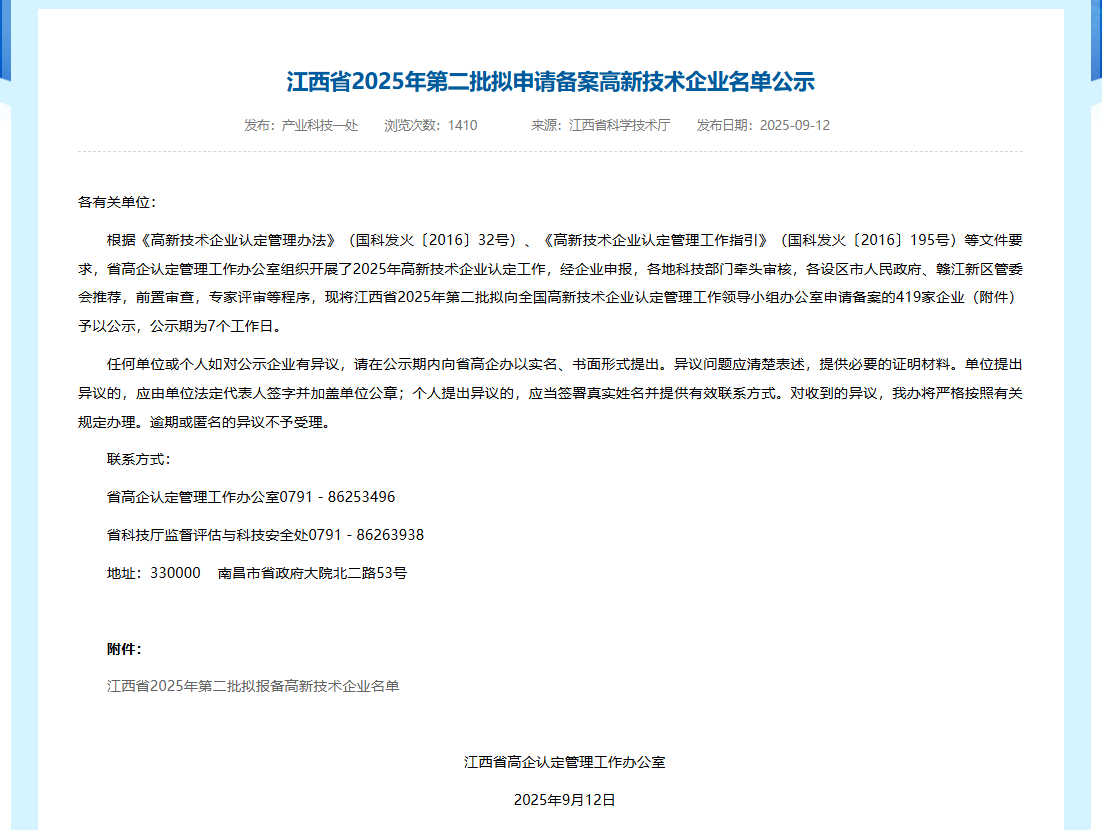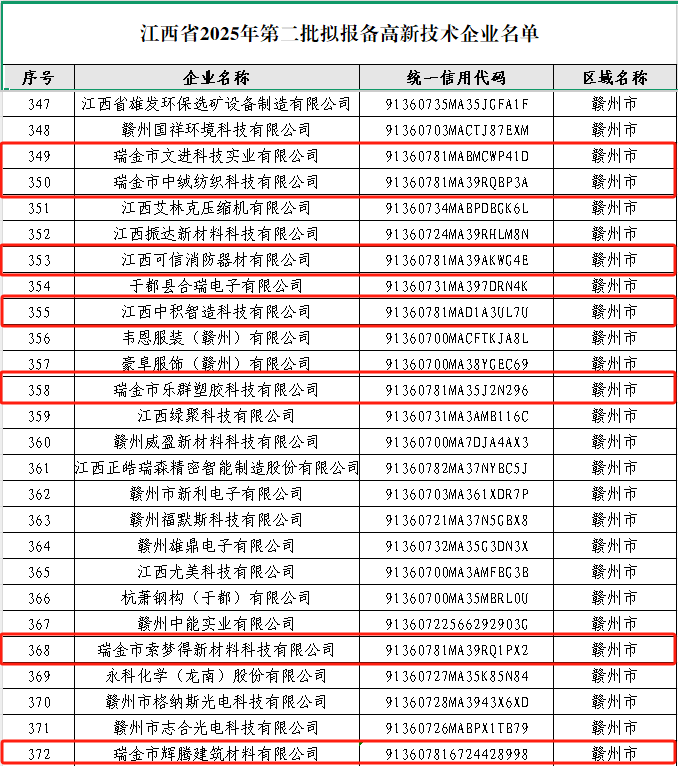 江西省2025年拟报备高新技术企业名单公示,瑞金市11家企业上榜