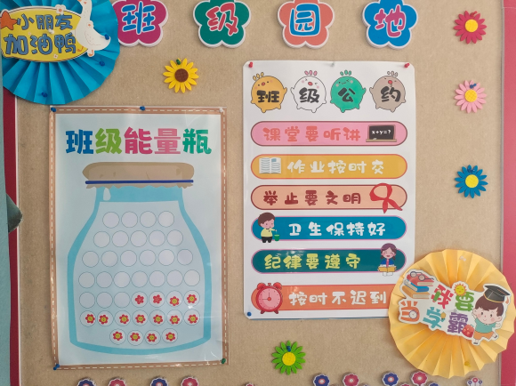 班级园地:记录成长足迹,激励向上动力。班级园地是孩子们展示自我、互相激励的重要平台。这里有色彩鲜艳的“班级能量瓶”,记录着孩子们的点滴进步;有明确的“班级公约”,如“课堂要听讲”“作业按时交”“卫生保持好”等,每一项都配有生动的插图,引导孩子们自觉遵守纪律、养成良好习惯;还有充满童趣的“我要当学霸”等激励语,鼓舞着孩子们不断努力、追求卓越。