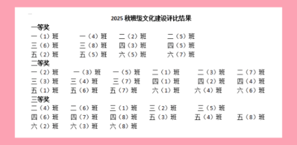 评比促提升,文化润心灵。本次评比活动由学校统一组织,各年级评委老师深入班级,从整体环境、设计特色、育人理念等方面对各班文化布置进行了认真细致的量化打分。最终,每个年级评选出一等奖2名、二等奖3名,其余为三等奖。评比结果将作为“最美班级”考核的重要依据,进一步激励各班持续优化班级文化,发挥环境育人的积极作用。