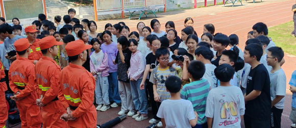 在操场活动区,消防员重点向学生展示了各类消防器材。他们逐一介绍了设备的名称、用途及操作方法,通过实物演示让学生直观了解消防工具的使用场景和基本原理。学生们围在消防员周围,认真聆听讲解并观察器材细节。