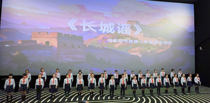 在温馨的签到环节后,四位学生代表以历史、现实与未来为脉络发表了演讲。他们从回顾苦难到歌颂觉醒,从缅怀先烈到激励当代,完成了一场从历史悲怆到时代担当的情感升华与思想动员。紧接着,成都师范附属小学雏鹰合唱团献唱《长城谣》,歌声清越悠扬,情感充沛,将现场氛围推向首个高潮。