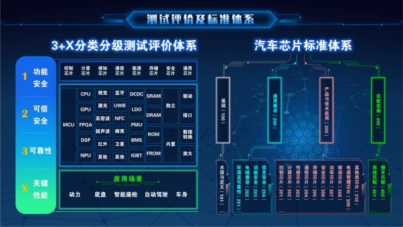 标准化发展是产业高质量发展的基石。中汽芯支撑编制的《国家汽车芯片标准体系建设指南》于2024年1月发布,基于车规芯片技术结构及应用场景需求搭建标准体系架构,以汽车技术逻辑结构为基础,提出标准体系建设的总体架构、内容及标准重点建设方向,为加快研究制定国内各级各类汽车芯片标准发挥了关键指引。到2025年底,将制定汽车芯片重点标准30项以上,到2030年将制定其他相关标准70项以上,不断推动国产车规芯片标准检测体系从“跟随”走向“引领”。