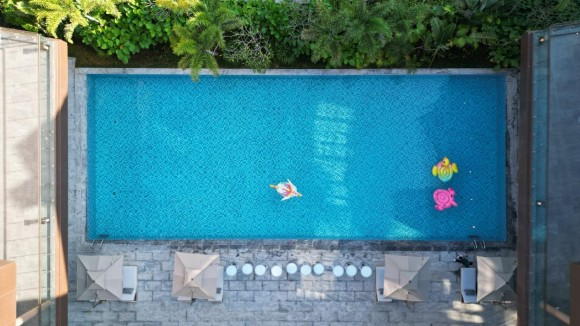 图为普洱景迈假日酒店泳池鸟瞰图 (2025年10月22日,朱翔摄)