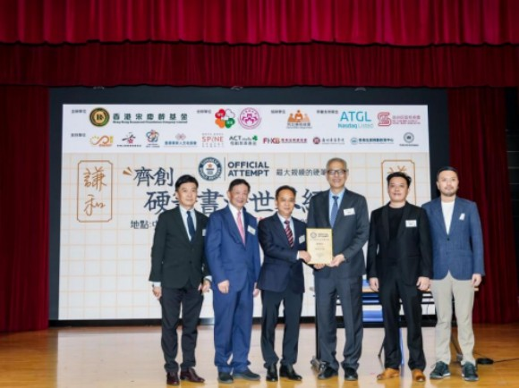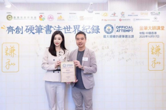 2025年10月17日,梁显利油麻地社区中心热闹非凡,一场洋溢着文化气息与青春活力的“金笔大师讲堂——齐创硬笔书法世界纪录”活动在此盛大举行。该活动由香港宋庆龄基金、We Like Hong Kong、沪港妇女会主办,香港民政事务总署协办,香港生涯规划教育中心等单位积极支持。来自香港油尖旺区多间中小学的 291名学生齐聚一堂,成功挑战“最大规模硬笔书法课”健力士世界纪录™,为庆祝祖国成立76周年献上了一份饱含中华文化底蕴的厚礼。中联办教育科技部叶水球副部长、香港特别行政区政府油尖旺民政事务专员余健强先生担任活动主礼嘉宾。