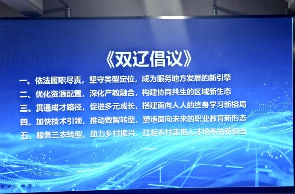 闭幕式上,由全国县级职教中心联盟发起的《关于推动新时代县域职业教育高质量发展的双辽倡议》经与会代表审议并通过。《双辽倡议》是联盟与会代表在对中国职业教育和技工教育发展历史进行深入追溯并结合当前县域职业教育发展实际形成的本次会议的主要成果。《双辽倡议》号召全国县级职教中心联盟成员单位,要依法履职尽责,坚守类型定位,成为服务地方发展的新引擎;优化资源配置,深化产教融合,构建协同共生的区域新生态;贯通成才路径,促进多元成长,形成面向人人的终身学习新格局;加快技术引领,推动数智转型,塑造面向未来的职业教育新形态;服务“三农”转型,助力乡村振兴,扛起农村实用人才培养的新担当。《双辽倡议》的发布,为教育强国背景下的县域职教现代化发展指明了新方向,为全国县级职教中心协同发展注入了新动力。