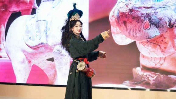 现场还特别呈现了《骑马击腰鼓女俑》的独立复原展示。该形象复原自西安博物院馆藏、金乡县主墓出土的唐代骑马击鼓女俑。表演中,舞者头戴孔雀冠,冠上彩羽翩然垂落肩背,身着圆领窄袖男装长袍,足蹬黑色高靿尖头靴,双手作击鼓状,生动再现了唐代女性英姿飒爽、骑马击鼓的华美场景。