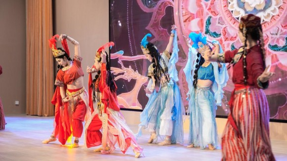 为打破传统讲座的单向输出模式,本次活动创新采用“文物+艺术复原+文创展示”的融合形式,打造多维沉浸式文化空间。西安工程大学汉服研究院现场演绎《胡旋舞》与《龟兹舞》复原表演,舞者在鼓乐声中急速旋转,再现“胡旋女,心应弦,手应鼓”的异域风情,赢得观众阵阵掌声。