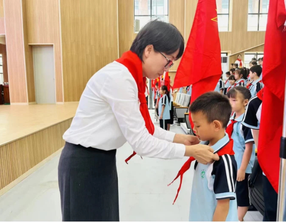 激昂的《出旗曲》中,旗手护送队旗入场,全体师生肃立行礼,嘹亮的队歌点燃现场庄严氛围。罗雯雯副校长宣读新队员名单,五年级老队员为新队员佩戴红领巾,完成红色使命传承。