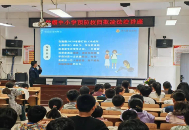 近日,江西省赣州市寻乌县桂竹帽中小学邀请桂竹帽镇派出所潘警官、刘警官走进校园,为全体学生带来一场主题鲜明的防校园欺凌法治教育课,通过深入推进党建引领社校合作,筑牢校园安全防线,共建安全文明法治校园。