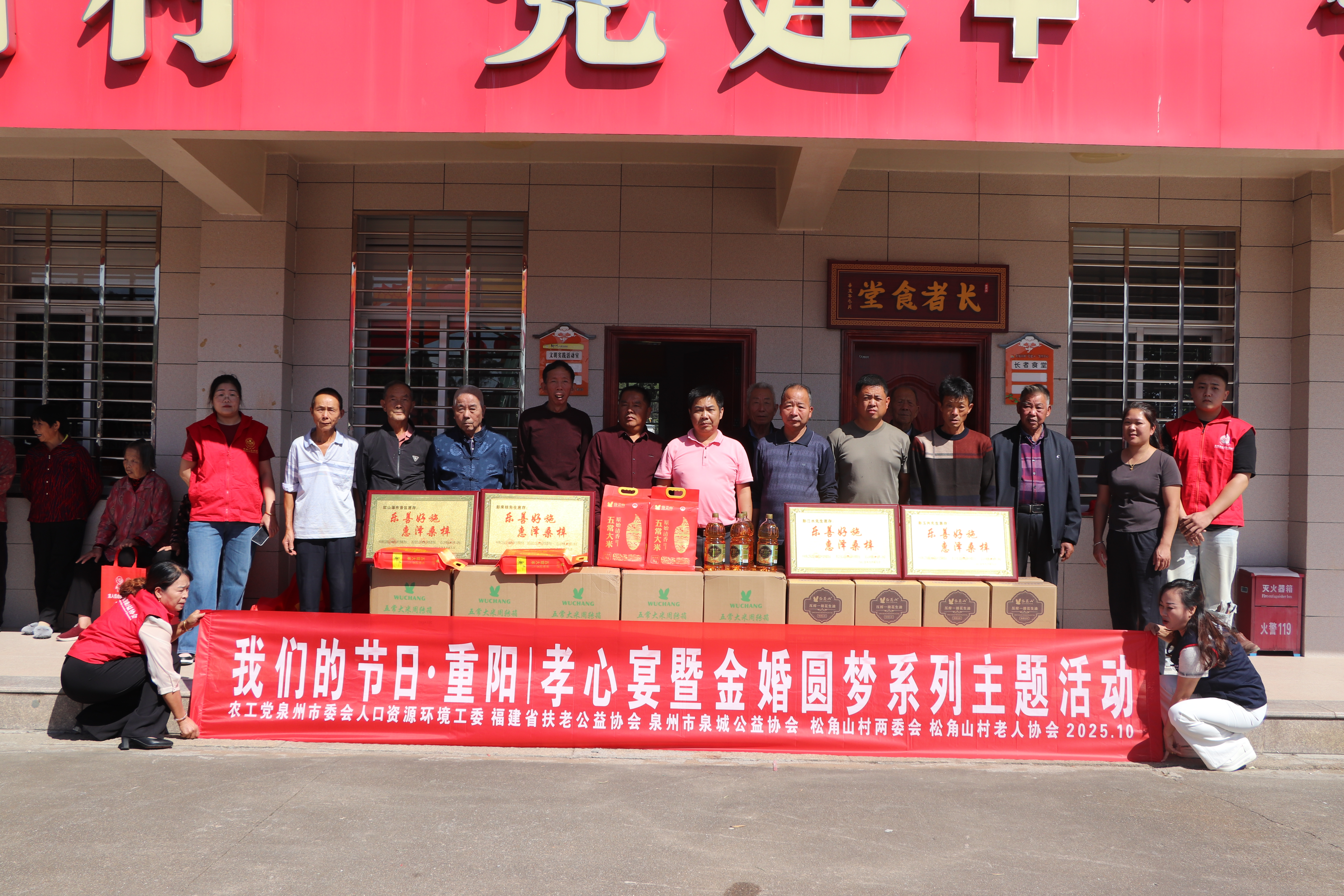 岁岁重阳寄深情,敬老爱老暖人心。2025年10月29日重阳节当天,泉州市洛江区虹山乡松角山村格外热闹——由村两委、老人协会主办,福建省扶老公益协会联合农工党泉州市委会人口资源环境工委、泉州市泉城公益协会协办的“我们的节日・重阳|孝心宴暨金婚圆梦系列主题活动”温情启幕,为全村60岁以上老人送上满满的节日关怀。