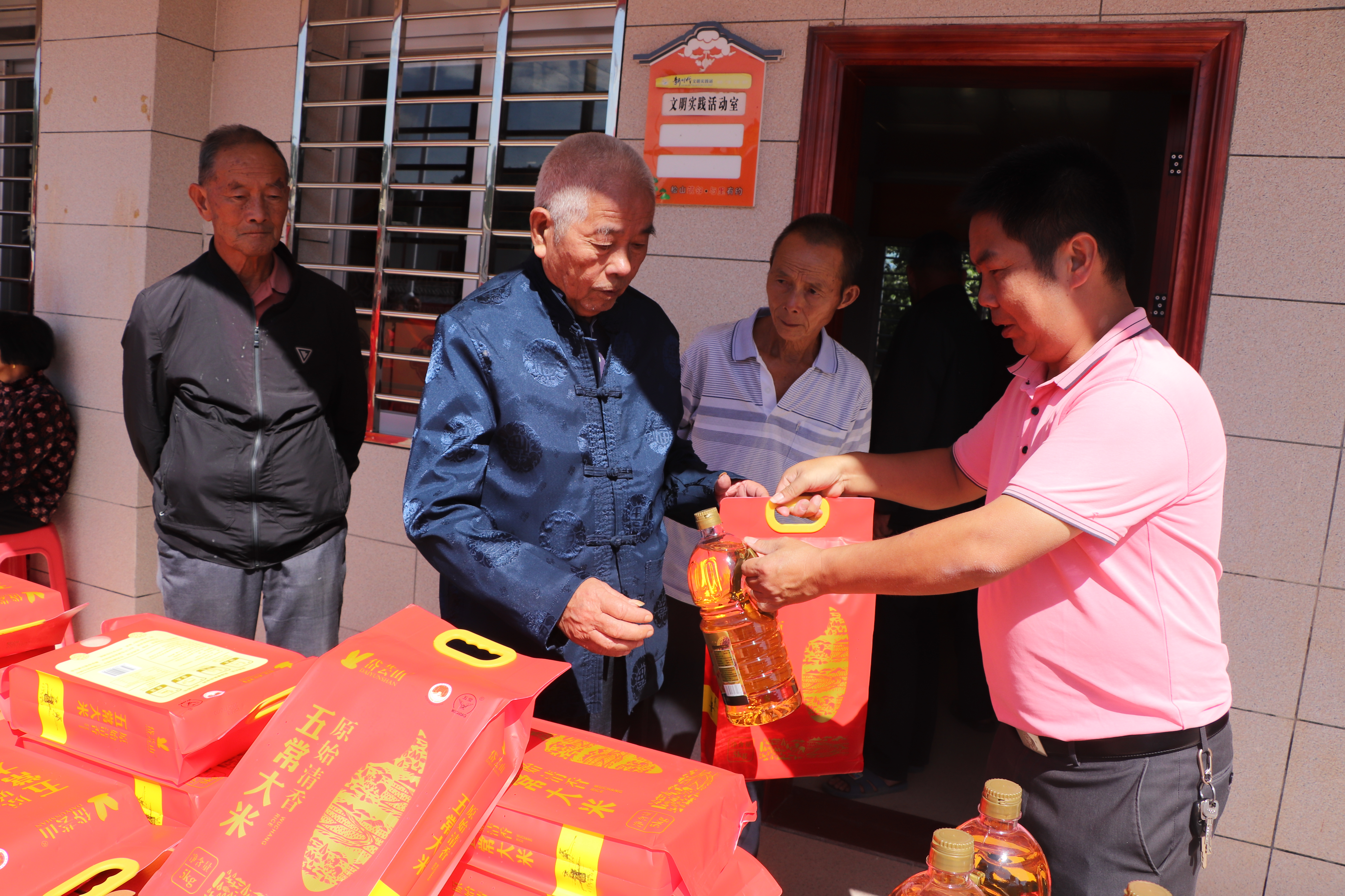 活动能顺利办起来,离不开大家伙儿的热心帮忙。热心村民彭来枝送来大米,彭江水、彭玉兴捐了食用油,虹山瀑布景区还特意拿出5000元经费,这些爱心最终变成475份米油礼包,挨个儿送到老人手里。现场更是贴心:虹山乡卫生院的医生坐诊义诊,量血压、答疑问,帮老人把健康“查清楚”;志愿者带着工具来义剪,边剪边问老人喜好,剪完头发的老人都透着精神劲儿。“不用跑远路就有人看病,剪完头整个人都轻快了!”刚体验完服务的黄阿婆笑得合不拢嘴。