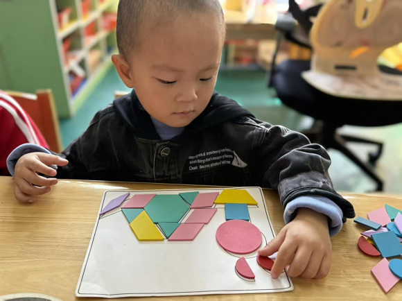 活动中,孩子们围坐在桌前,专注地摆弄着色彩鲜艳的几何拼块:三角形、圆形、六边形等形状在小手中灵活组合,有的孩子认真对照模板填补图形空缺,有的则发挥想象自主创意拼搭。从专注的眼神到灵巧的动作,孩子们在动手过程中感知形状特征、锻炼手眼协调,更在完成作品的瞬间收获了满满的成就感。