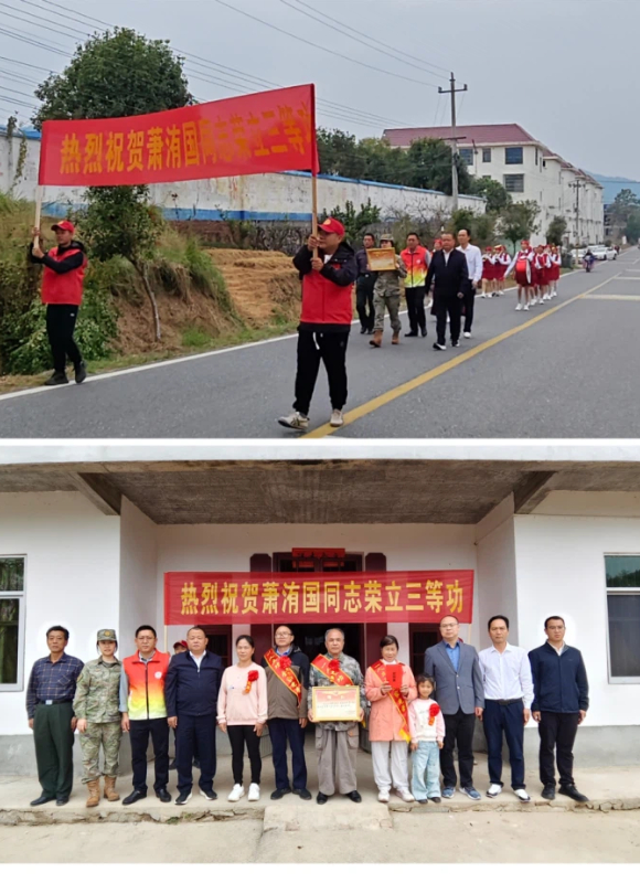 10月28日,江西省赣州市兴国县退役军人事务局联合县人武部、县关爱退役军人协会,会同鼎龙乡、城岗镇党委、政府,为荣立三等功的现役军人肖明、萧洧国等家庭送上三等功喜报和慰问金,传递党和政府的关怀与温暖,进一步弘扬拥军优属的光荣传统,营造“一人当兵,全家光荣”的浓厚氛围,让军人家属共享这份荣耀和喜悦。