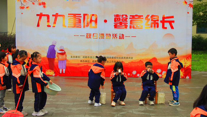 金秋送爽,佳节情浓。为深入践行“温江一家亲”理念,推动“温而有度邻相济·我为小区添把力”新老市民融合行动走深走实,10月29日上午,瑞泉馨城社区联合成都众方达社会工作服务中心,在F区广场成功举办“九九重阳·馨意绵长”秋日漫游活动。本次活动以传统重阳节为契机,融合趣味互动、非遗体验与社区共建,吸引了近60名居民积极参与,有效促进邻里互动,增强社区凝聚力,营造了温馨和谐、文化浸润的节日氛围。童声献礼,温情开场