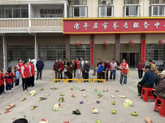 最后的“蔬菜套圈”游戏将活动推向了又一个高潮。地上摆放着卷心菜、茄子、萝卜等各式新鲜蔬菜,长者们跃跃欲试,孩子们在一旁加油助威。每当有长者套中,现场便爆发出热烈的欢呼声。这项活动既富有趣味性,又为长者们带来了实实在在的“战利品”,让大家在运动中收获了快乐与健康。