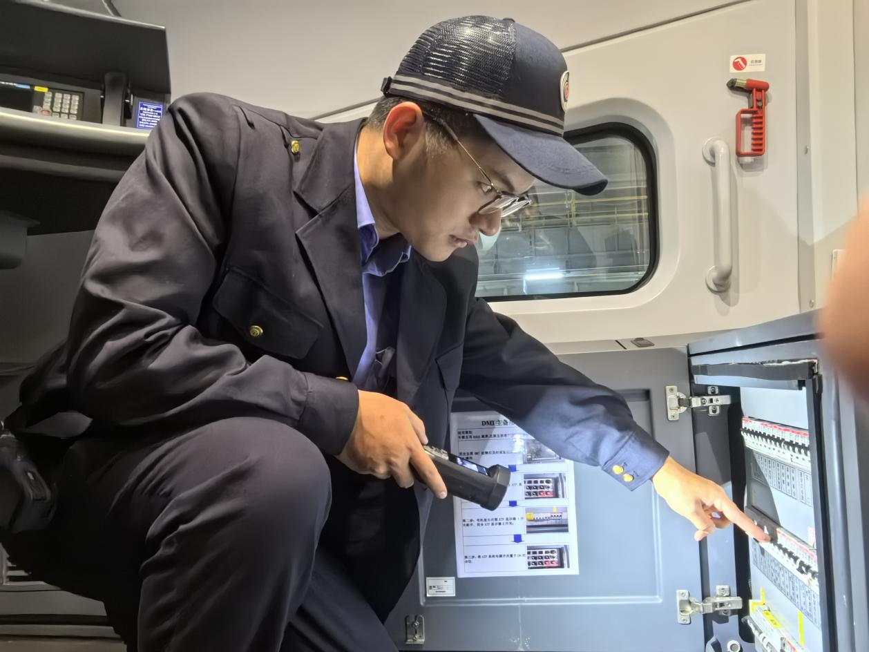 图为南昌西动车组运用一所动车组机械师检查配电柜状态。(杨雨轩摄)