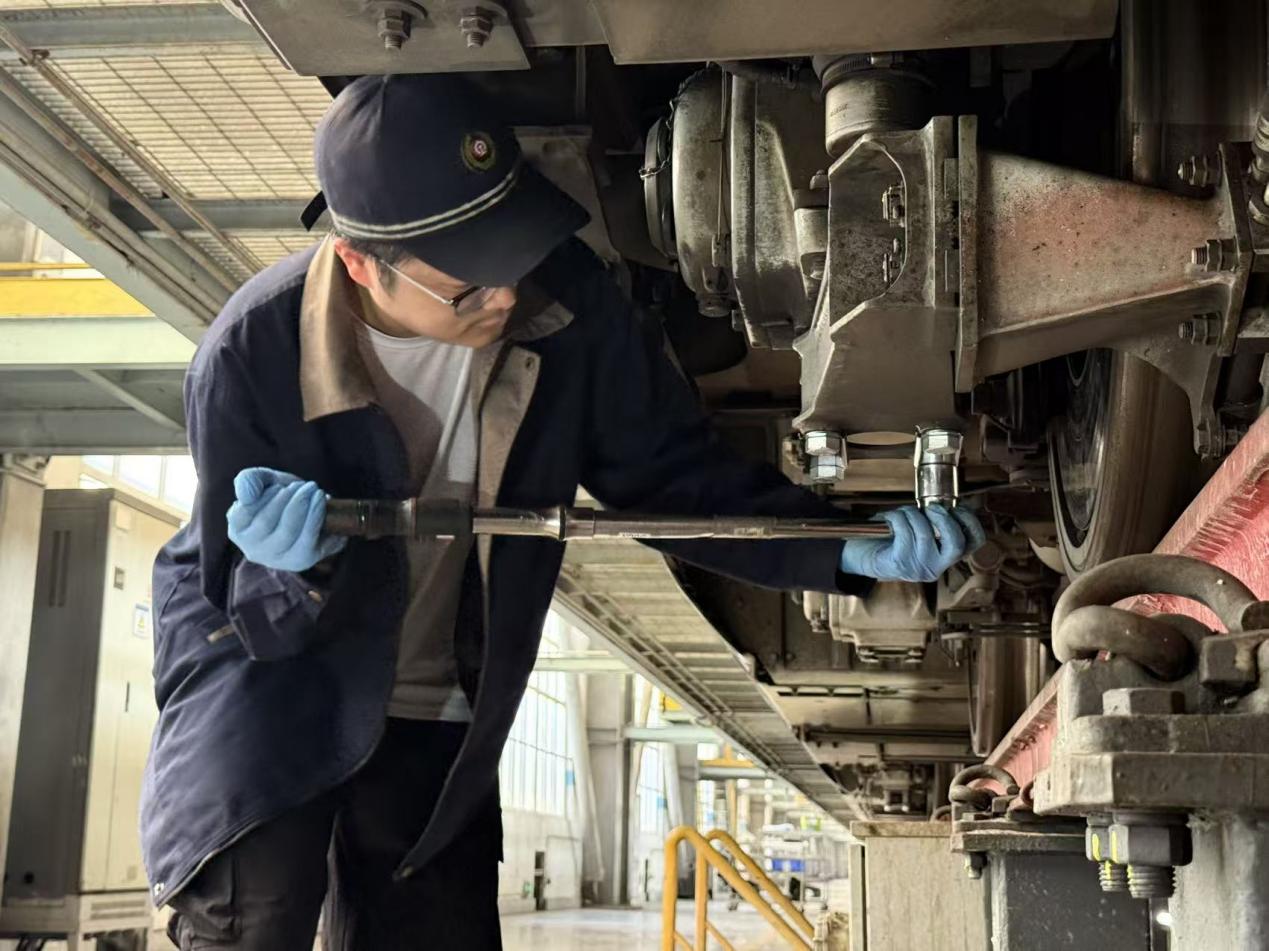图为南昌西动车组运用一所动车组机械师对走行部配件进行紧固。(邓子圣摄)