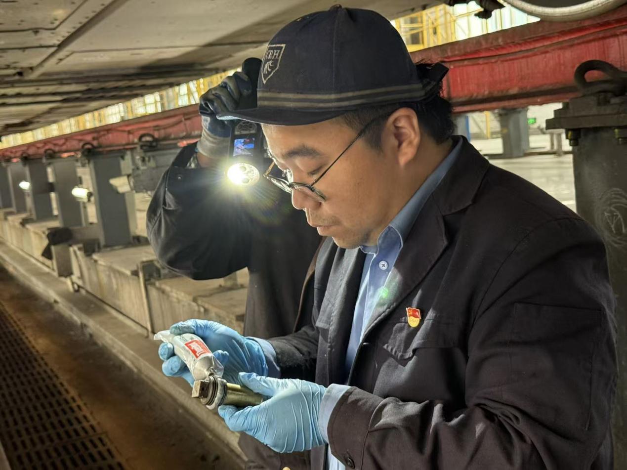 图为南昌西动车组运用一所动车组机械师测量受电弓碳滑板数值。(杨雨轩摄)