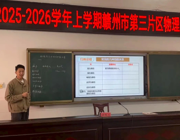 瑞金第一中学赖路生执教示范课《功能关系与能量守恒定律》。他以具体案例为依托,抽象提炼“功-能关系”普遍规律,并深入解析能量转化与守恒的科学本质。课堂以“温故知新”切入,引导学生回顾重力、弹力、电场力等做功特点,借助板书与多媒体动画直观呈现功能关系。学生积极参与互动思辨,课堂氛围活跃,赖老师深度践行“以学定教”教学理念,引导学生逐步构建起能量守恒的系统化认知体系,获得听课教师的一致好评。
