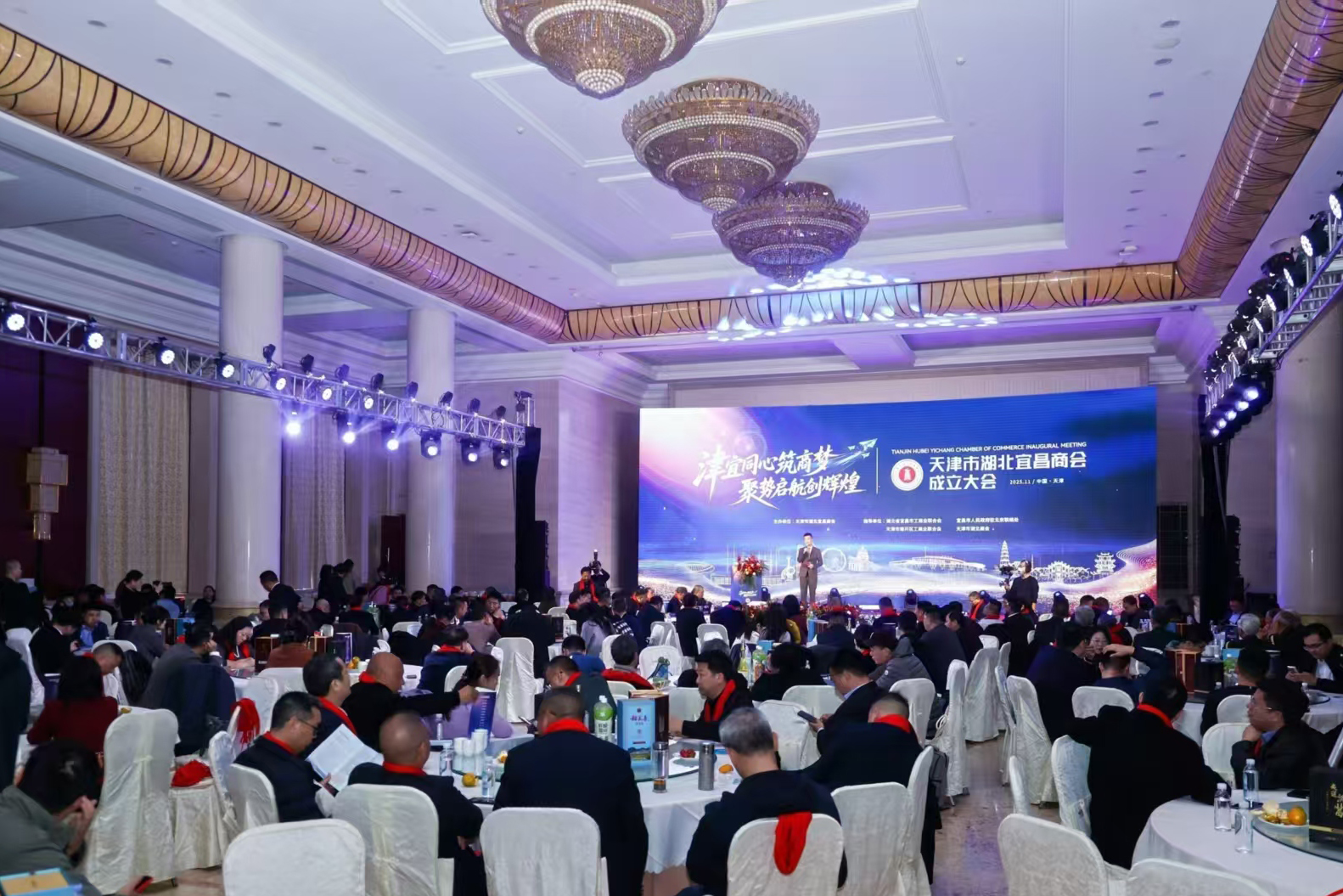 2025年11月1日,天津市湖北宜昌商会成立大会在天津大礼堂隆重举行。湖北省宜昌市委常委、统战部部长张金安,天津市南开区委常委、统战部部长王立民等两地党政领导、企业家及全国多地商会代表近400人齐聚一堂,共同见证了这一重要时刻。大会选举天津市盛荣电气董事长郭东林为首任会长。