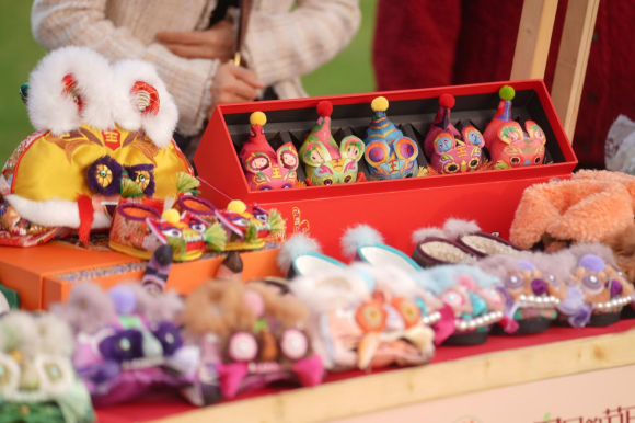 如果说赛场内的文化演出是“视听盛宴”,那么赛场外精心设置的文化市集,则呈现了一场可触、可感、可参与的“文化之旅”,现场展示了非遗产品老虎鞋和乌汁蛋,以及大米、蔬菜水果等农产品,让市民们可买可吃可玩。