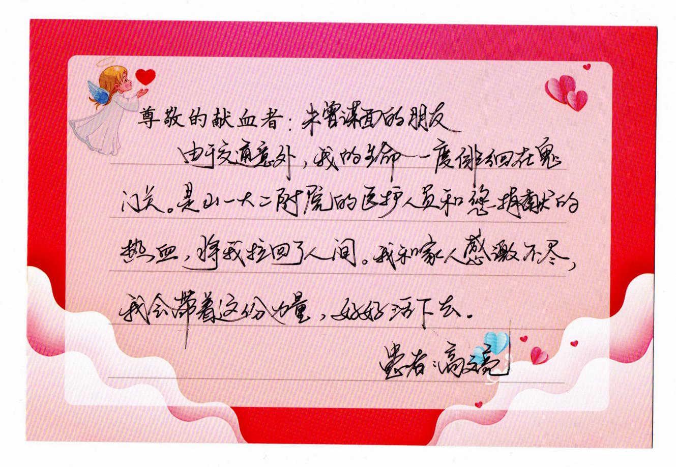 “由于交通意外,我的生命一度徘徊在鬼门关。是山一大二附院的医生们和您捐献的热血,将我拉回了人间……”从车祸创伤中闯过生死关的高某某,发自肺腑地表示,要带着这份来自陌生人的力量,好好活下去。