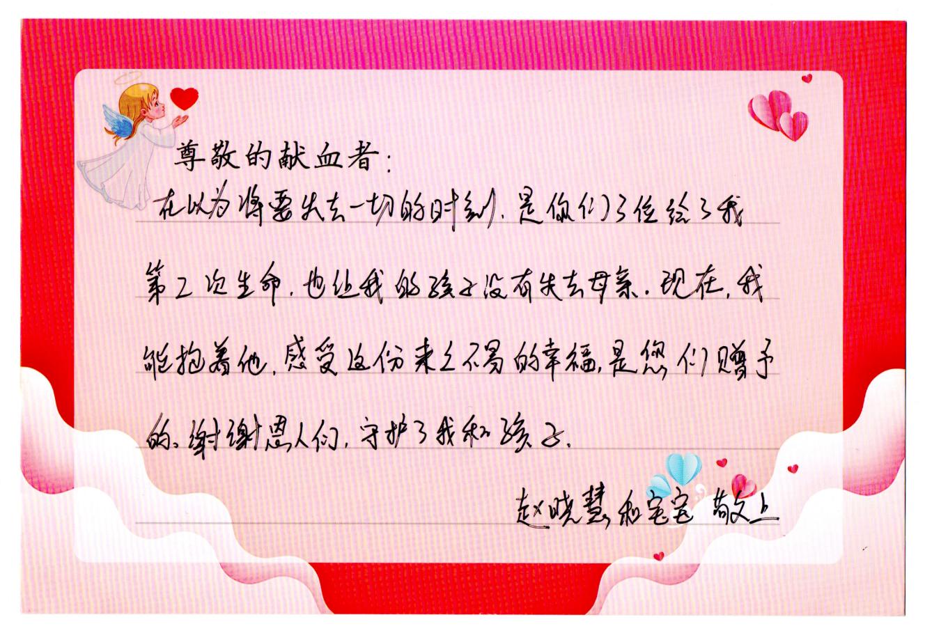 “在以为将要失去一切的时刻,是你们3位给了我第二次生命,也让我的孩子没有失去母亲……”刚刚经历产后大出血的赵某某,在信上诉说着劫后余生的感激与初为人母的幸福。那汩汩流入她身体的热血,守护了一个家庭的圆满。