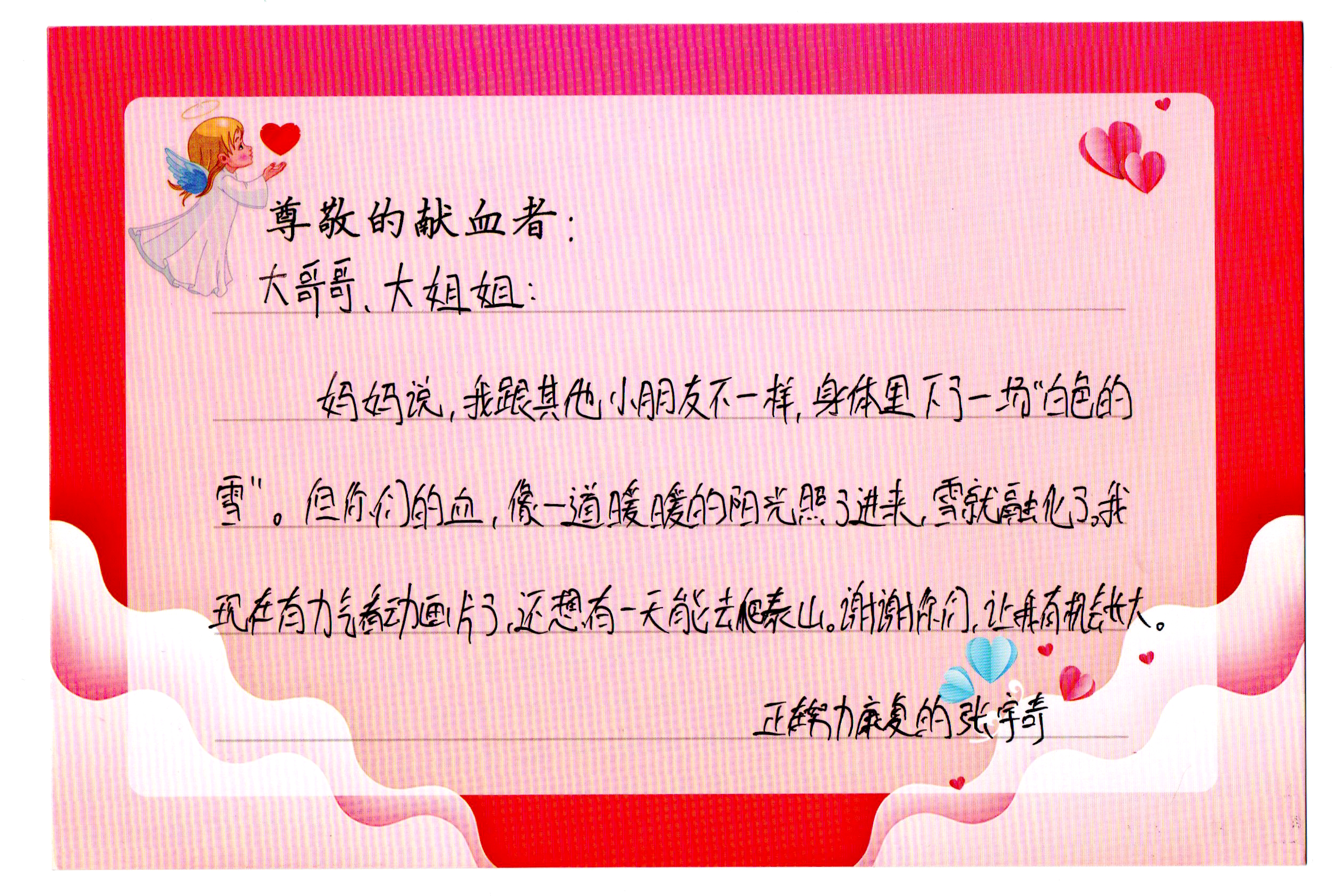 在这个讯息秒达的网络时代,最质朴真挚的情感,总是值得用最郑重的笔墨书写。尤其是当这封信跨越陌生的阻隔,从重获新生的患者笔尖流淌而出,寄予那位素未谋面却赋予其第二次生命的献血者时,字里行间所承载的,已不仅是感谢,更是一场关于生命、爱与希望的双向奔赴。
