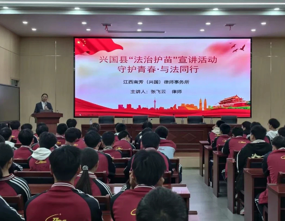 近日,江西省赣州市兴国县将军中学开展法治护苗专班进校园活动,进一步加强青少年法治教育,提升学生的法律意识和自我保护能力,营造平安、和谐、文明的校园环境。此次活动特邀县司法局三级主任科员曹斐、江西南芳律师事务所张飞云律师担任主讲,为该校高一年级的同学们带来了一场生动而深刻的“新法律宣传教育法”专题讲座。