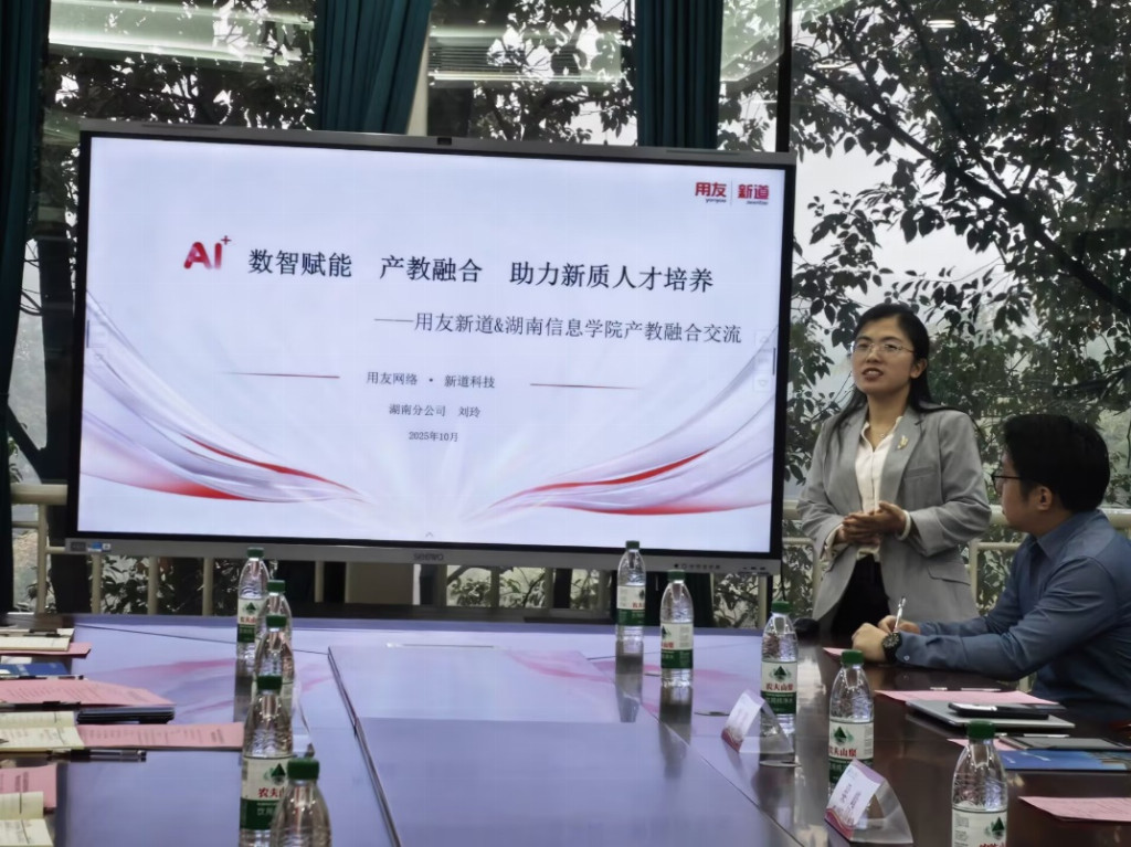 在新一轮科技革命与产业变革加速演进的时代背景下,发展新质生产力、推动数字经济高质量发展,已成为国家核心战略。这对高校人才培养提出了更高要求,特别是具备数智思维、跨界整合与创新实践能力的“新质人才”已成为产业发展的关键引擎。2025年10月30日,湖南信息学院与用友集团旗下新道科技股份有限公司(以下简称“新道科技”)隆重举行产教融合校企座谈会,双方围绕深化战略合作、共筑育人新高地展开深度对话,擘画了校企协同育人的新蓝图。