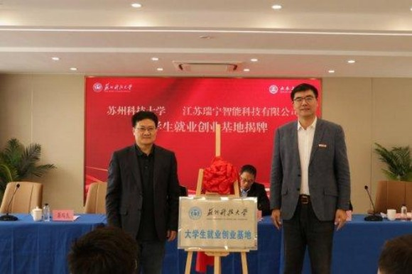 为进一步推动产教融合,苏州科技大学学生处处长章鸣与江苏瑞宁智能科技有限公司董事长龚瑞良共同为“大学生就业创业基地”揭牌。该基地将作为学生开展实习实践、项目孵化与科技竞赛的重要平台,实现人才培养与产业需求的无缝对接。