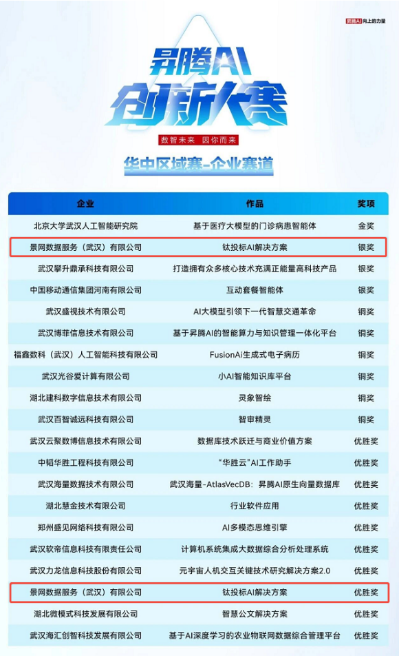 2025年11月26日,由华为技术有限公司主办的昇腾AI创新大赛2025华中区域赛在武汉光谷圆满收官。景网数据服务(武汉)有限公司自主研发的“钛投标AI解决方案”,从343支参赛团队中突围,斩获企业赛道银奖,以硬核技术实力赢得华为这一民营硬科技顶流企业的权威肯定,成为招投标AI领域与昇腾生态深度融合的标杆案例。