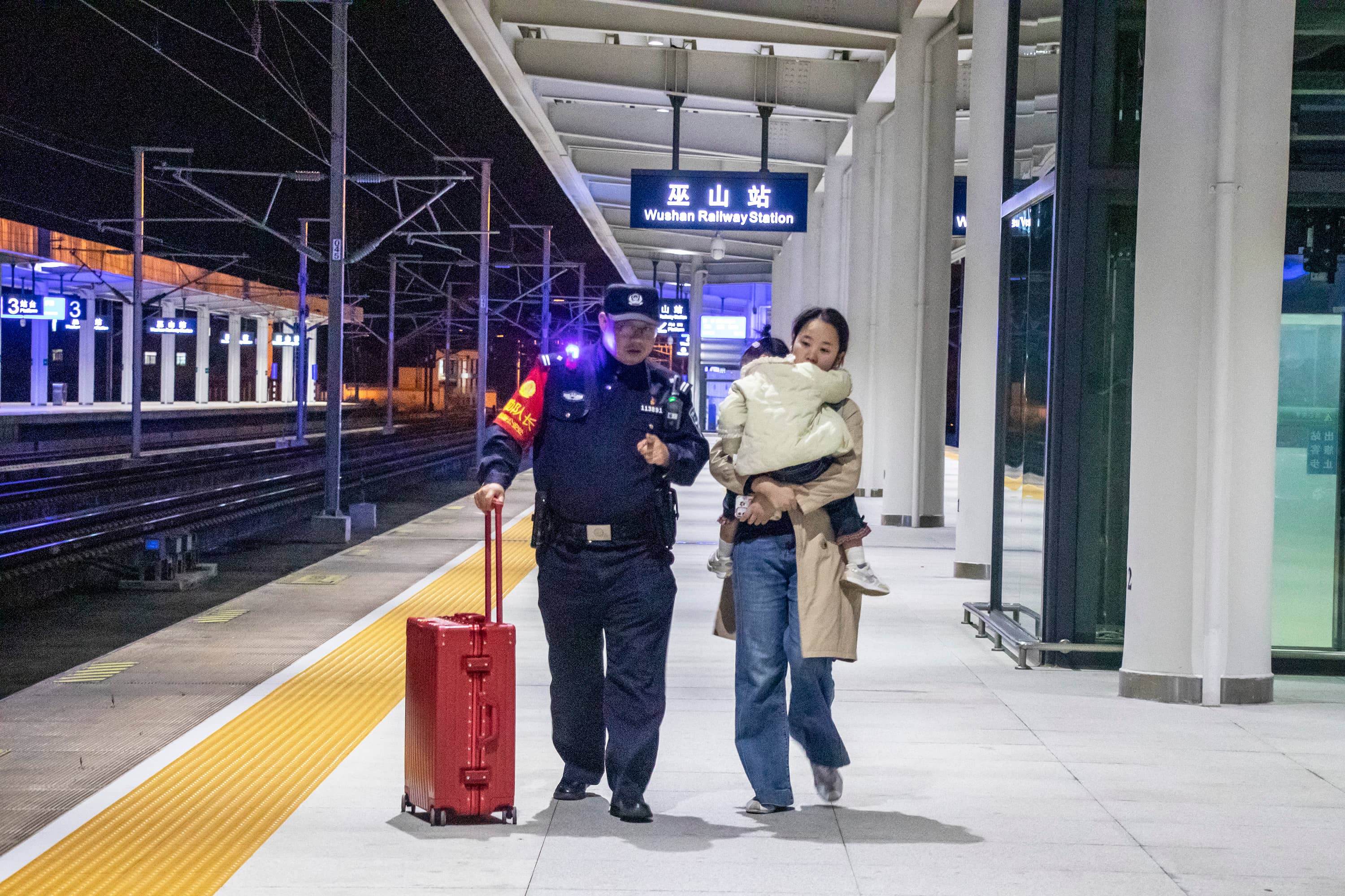 有警处警,无警便民。民警们在做好警情处置、治安防控的同时,还主动化身“旅游向导”,为旅客提供问路指引、应急救助等服务。11月30日,来自湖北宜昌的旅客陈先生,游玩期间不慎骨折,乘坐出租车到达巫山站接驳点后,拨打派出所电话求助。执勤民警立即协调巫山站,推来轮椅,护送其进站上车。“警察同志,太感谢你们啦,因为受伤情绪挺不好的。你们的热情帮助,心情一下就好了很多。”陈先生上车后,专门拨打派出所电话表达谢意。