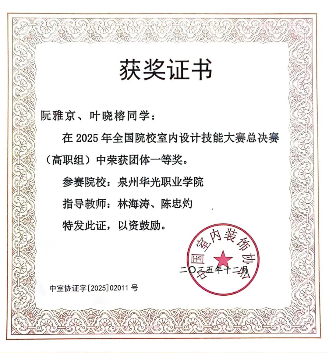 作为连续三年蝉联赛事一等奖的院校,泉州华光职业学院始终深耕职业教育改革,聚焦技能人才核心素养培育,通过以赛促练、产教融合等多种方式,不断提升学生的实践能力与创新精神。此次三连冠的佳绩,将进一步激励该校持续深化教学改革,为室内设计行业输送更多高素质技术技能人才。(姚志坚)