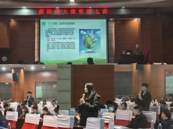 鄱阳湖大课堂(第7讲)由中华环保联合会副主席、联合国环境规划署原驻华代表涂瑞和先生主讲,来自资源环境学院、药学与生命科学学院、机械与智能制造学院、建筑工程与规划学院、管理学院、旅游与地理学院等学生代表聆听了报告。涂瑞和先生还与现场学生进行了深入互动交流。该环节由九江学院副校长王殿元主持。