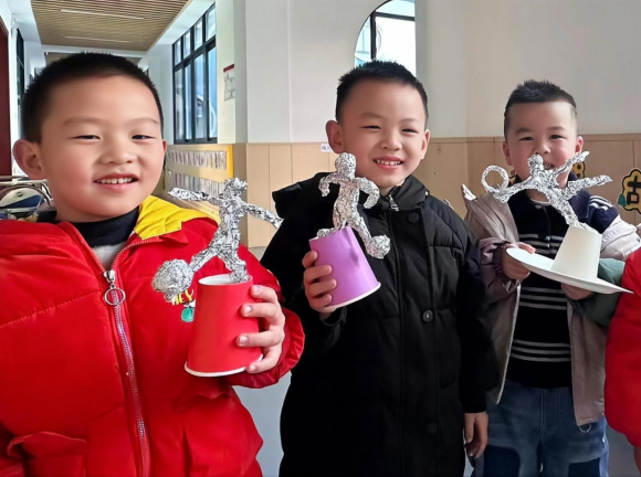 拿到锡纸的孩子们立刻化身“小小设计师”,专注地揉捏、塑形。有的孩子制作出奋力奔跑的小人,有的塑造出跳跃投篮的模样,还有的创意十足地做出打乒乓球的造型。过程中,孩子们互相分享经验,讨论如何让小人的动作更生动。不一会儿,一个个形态各异、充满活力的锡纸运动小人就诞生了。孩子们兴奋地展示自己的作品,脸上洋溢着满满的成就感。