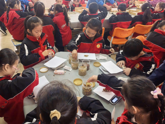 活动伊始,与会人员先后参观了智耘坊实践基地的劳动基地展示、无土栽培、气象观测、动物观察等科学与劳动融合项目,聆听了小讲解员的生动介绍。随后走进明德楼,参观了文明实践消防精品展、AI智能体育系统和农耕文化传承展。在2号楼,来宾们重点观摩了三年级“杏林初阳”中医文化科劳项目,中草药主题的走廊文化引人入胜,学生们在课堂上捣药、打称、做茶包、搓艾条,沉浸式体验中医文化的魅力。