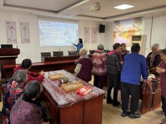 活动伊始,常熟市惠众社会事务的社工讲解,“冬至俗称冬节、亚岁,始于周朝,盛于唐宋”的文字与节气插画相映成趣。“古人常说‘冬至一阳生’,还把冬至分为三候——一候蚯蚓结,二候麋角解,三候水泉动,这都是自然对寒冬的回应。”社工一边指着PPT上的内容,一边分享民俗知识,还提及“邋遢冬至干净年”的老话,以及张仲景发明饺子、北京吃馄饨、苏州饮冬酿酒的各地食俗,生动的讲解让村民们频频点头,不时互相念叨“原来冬至有这么多讲究”。