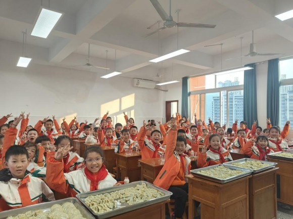热气腾腾的饺子出锅后送到各班,教室里顿时香气弥漫、欢声四起。孩子们兴奋地辨认着自己亲手包的饺子,品尝时眼里满是自豪。他们小心吹气、互相分享,还不忘将饺子送到老师、保安手中。这一刻,劳动的成果化作舌尖的温度,分享的快乐让“自力更生”不再只是一句口号,而是融入成长记忆里一份真实而温暖的收获。