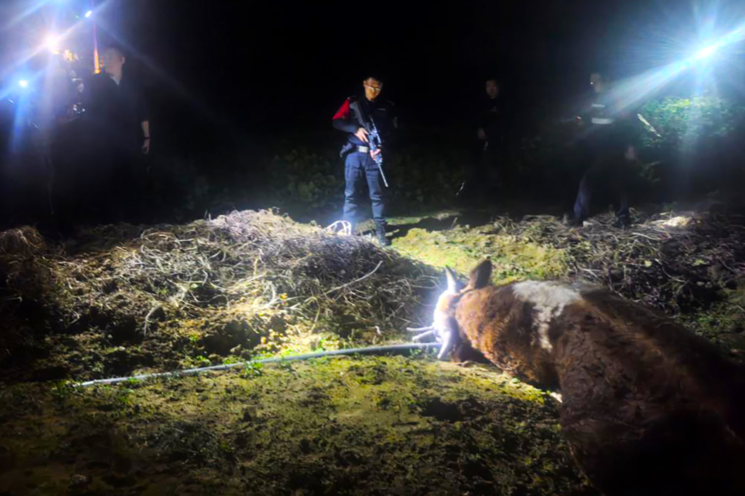 12月15日下午,万州区高峰街道一头黄牛在运输途中受惊失控,挣脱后攻击人员、损坏车辆,并窜入乡村区域持续狂躁,对村民安全构成严重威胁。万州区公安局高峰派出所接警后迅速到场,但该牛攻击性强,甚至冲撞警车。