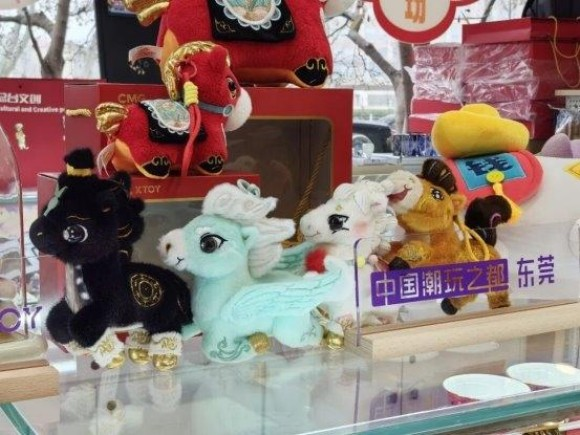 围绕“骐骥驰骋势不可挡”的马年春晚主题,东莞设计开发制造的产品覆盖毛绒、皮革、冰箱贴等三大文创潮玩品类。