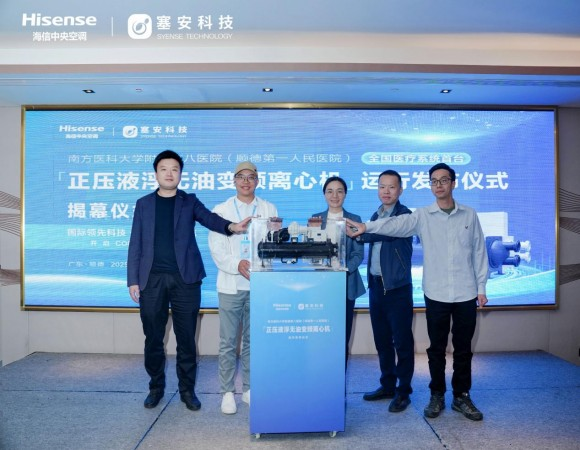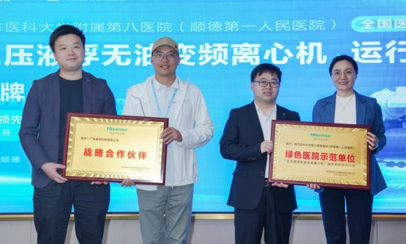 活动中,海信日立向院方授予“绿色医院示范单位”牌匾,向塞安科技授予“战略合作伙伴”荣誉,标志着三方在绿色医院建设中的深度协同。随后,嘉宾们共同揭幕,象征全国医疗系统首台正压液浮无油变频离心机正式投入运行。