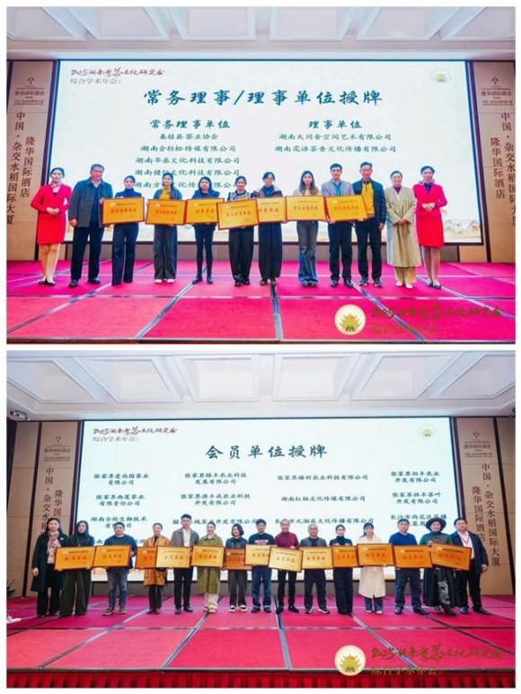 会上,研究会执行会长毛鑫就《茶文化及健康服务能力第一部分茶调理师团体标准》草案的编制工作进行了专项汇报与说明,该标准的编制是贯彻落实“三茶统筹”发展理念、推动茶产业与大健康深度融合实践的生动实践,由湖南省茶文化研究会牵头,联合湖南中医药大学、湖南省农业科学院茶叶研究所、湖南省茶业集团、新宁县舜帝茶业有限公司、湖南五韵茶苑文化传播有限公司、张家界原邦农牧发展有限公司等高校院所及企业的知名专家力量,共同推动行业标准规范化建设。他表示,希望未来有更多行业专家和企业共同参与到团体标准的建设与完善中,汇聚行业智慧,提升标准质量,推动茶调理领域向科学化、规范化、协同化发展迈进。随后,会议举行了常务理事单位、理事单位及会员单位的授牌仪式,进一步凝聚行业共识,激发创新活力。
