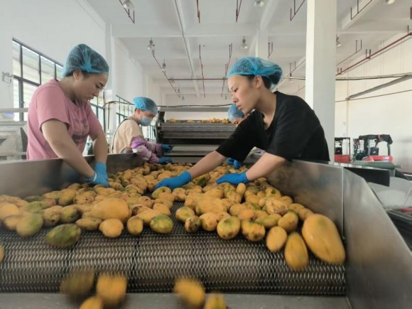 ▲图为广西田东鲜友农业开发有限公司工人清洗芒果公果和次果