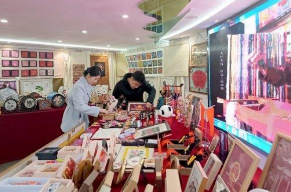 “这件作品的针法太细腻了!”“这个设计既传统又时尚!”赞叹声此起彼伏。几位本地参观的市民也对这些作品爱不释手,纷纷询问购买方式,展现出对青绣作品的浓厚兴趣。