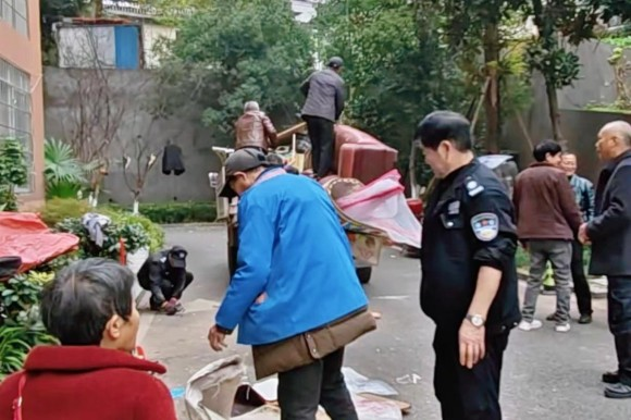 2025年12月19日,璧城街道黄葛社区东林丽景小区,工人们正将楼道里堆积多年的旧农具、废弃物品搬上卡车。居民李嬢嬢站在一旁,目光却落在墙角那背篓上——那是她从老家带进城,却因无处存放只能堆在楼道的“老伙计”。