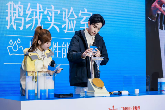 本次活动的核心环节为微型鹅绒实验室展示。胡一天以比音勒芬首席实验工程师的身份,通过多项专业测试,向现场观众直观呈现新疆鹅绒的优异品质。在蓬松度测试中,相同克重的比音勒芬新疆鹅绒蓬松度以肉眼可见的优势,力压普通鹅绒;在洁净度、绒子含量等后续测试中,该产品更是展现出蓬松度 FP800+、清洁度 1500mm+、绒子含量>95%的核心优势。此外,通过冷膨胀实验及防风、防水测试,比音勒芬黑科技面料的防风、拒水与锁温性能得到充分验证,凸显了产品内保暖、外防护的双重御寒特性。
