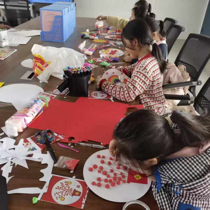 手工创作环节更是创意迸发。孩子们利用彩纸、黏土、废旧材料等,发挥奇思妙想,制作出一件件独具特色的作品。黏土捏成的新年福袋、彩纸折叠的立体贺卡……每一件作品都充满童趣与巧思,承载着孩子们对新年的无限遐想。大家一边创作一边交流,互相学习技巧、启发思路,社团教室里充满了欢声笑语,洋溢着浓厚的节日氛围与艺术气息。